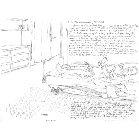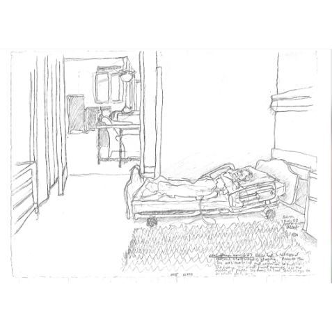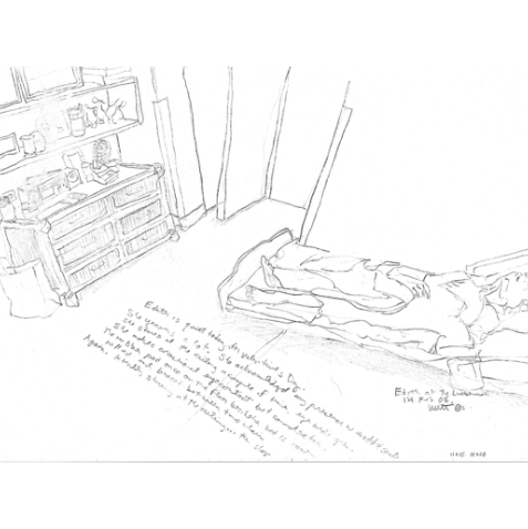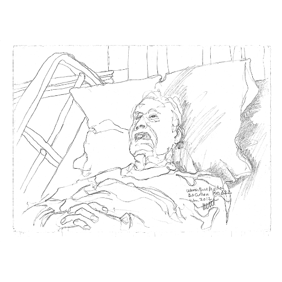 Paul has been a hospice volunteer since (DATE), and has drawn people on their last moments, days, months and years. These drawings will never be sold, however when he looks at them as a collection it says something about how we value life or how we as individuals face the end of our time. To Paul it’s reverence for that person that I don’t know, and that person’s life, and whatever they’re trying or have tried to do with their life. And in a different way when Paul’s drawing a musician, that’s sort of what he’s doing, he’s drawing them and what they’re doing and their life and making it important.